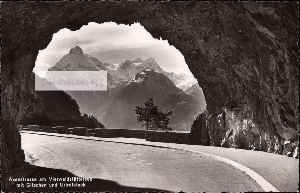 #axenstrasse vierwaldstättersee oder ist es hier schon der urnersee #schweiz: axenstrasse. One black and white postcard with a divided back.